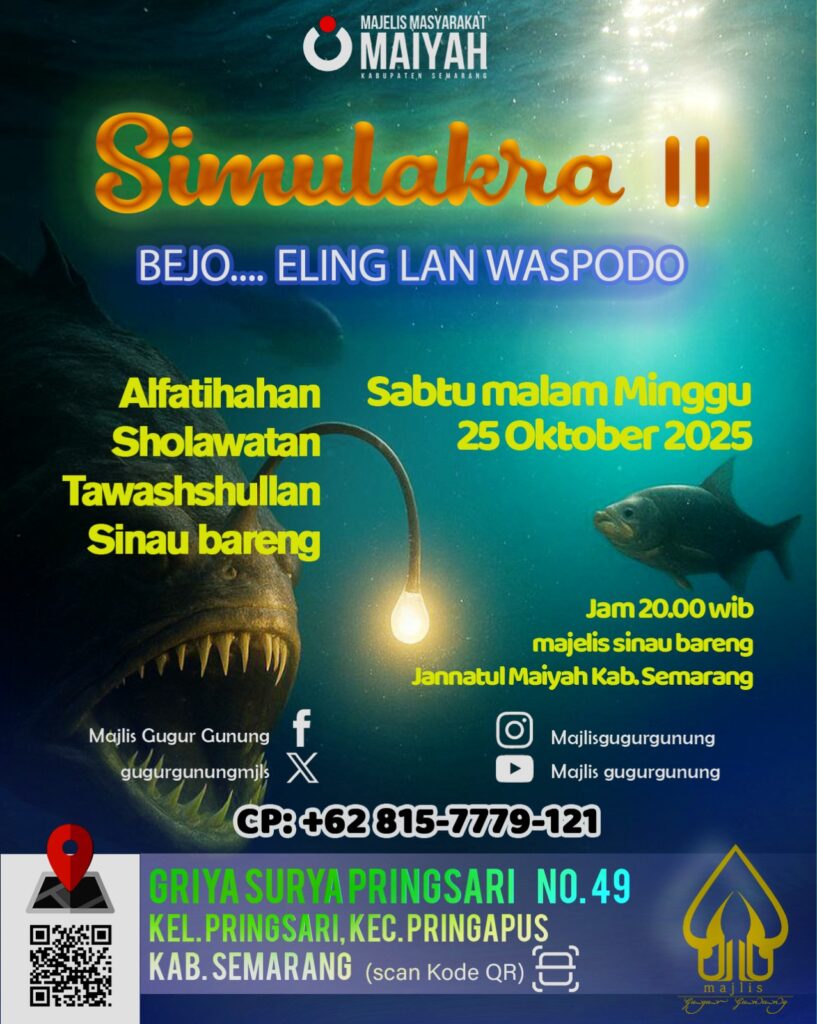Sebagai landasan informasi, bahwa tema ini merupakan sesi ke dua Simulakra yang pada awal tahun Muharram kemarin menjadi tema bahasan demi bekal menjalani tahun baru dengan kondisi yang tentu akan berkembang. Perkembangan baik ‘hanya’ menyiapkan syukur. Sedangkan perkembangan ‘tidak baik’ perlu menyiapkan bukan hanya syukur, namun juga sabar, tangguh, mawas diri, dan terlebih lagi adalah terus bersambung kepada Allah SWT dan meneladani Rasulullah SAW.